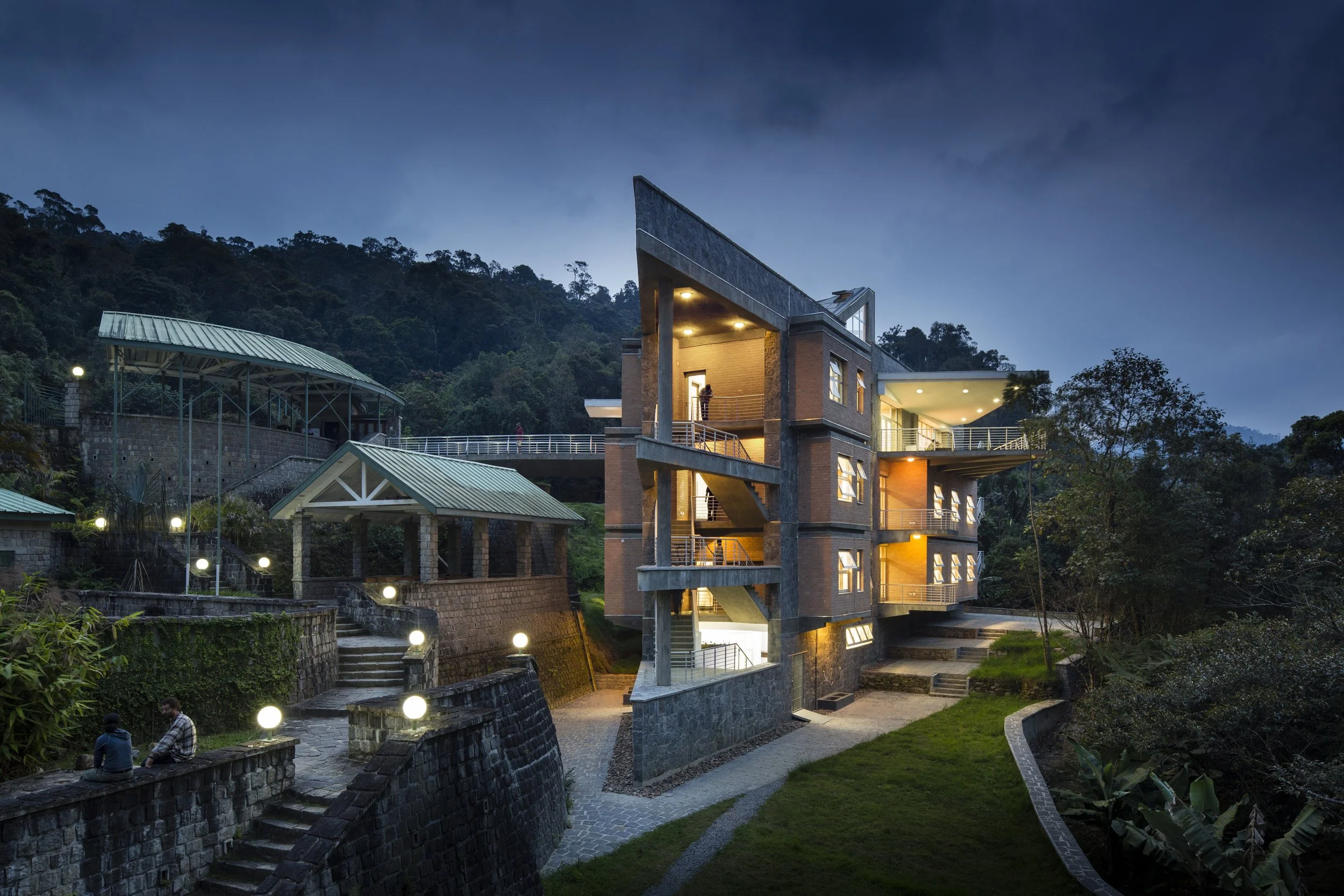 Overall, the building's wedge-like form conforms to the topography without requiring the removal of any vegetation or modification of the existing sitework. A footbridge links the drop off area with the entry level of the Institute, on axis with the spectacle of Ranomafana National Park. Beneath this public floor are the residence hall levels. Rooms here are gathered around a central area (much as dwellings in local villages), to encourage socializing and the sharing of knowledge. In the spirit of the green principle “long life, loose fit,” the sleeping rooms themselves have non-load bearing walls to allow future flexibility in reconfiguring the building to meet changing needs.