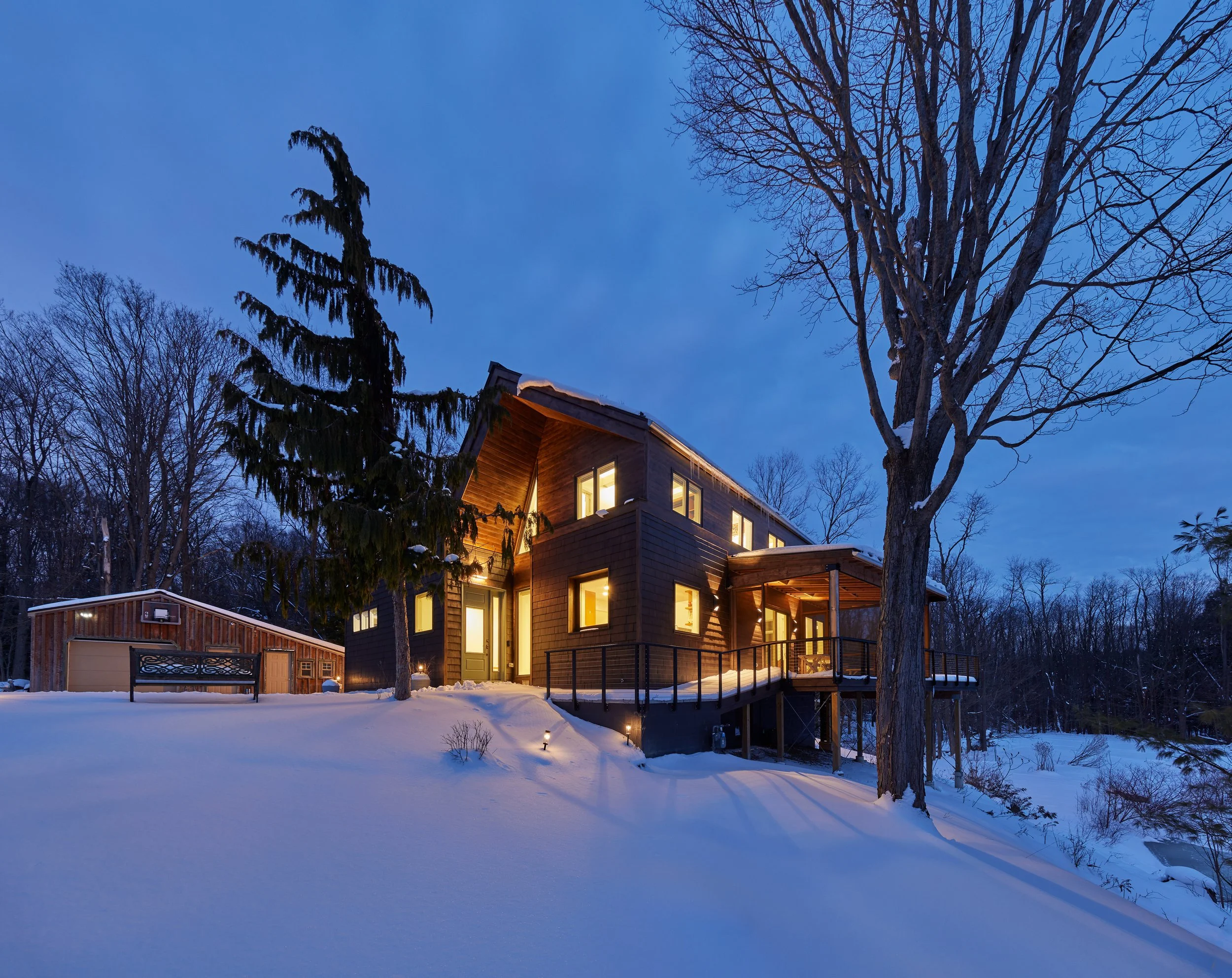 A DIALOGUE BETWEEN DWELLING AND PLACE. Perhaps the biggest challenge was reinventing the form. The owner nudged us towards this “jaunty-angled hat” as a solution to reinforce the dominant east-west axis while also opening it to the south. To achieve that form we pressed down the entry-side roof to its north. Then we reconfigured, re-clad, and reduced the remaining 2-story north-side sleeping volume. The resultant form achieves legibility and directionality: a house that reaches up, and out.
